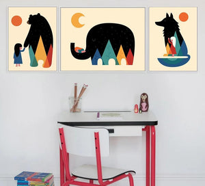 Nordic Art Cartoon Animal Poster Elephant Bear Wolf Minimalist Canvas Painting Nursery Wall Picture Kids Baby Room Decoration